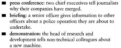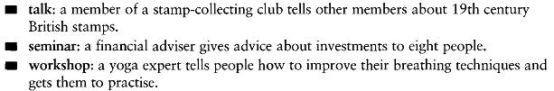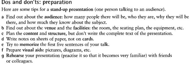 What you do not say is at least as important as what you do say. Your body is speaking to your audience even before you open your mouth. Your clothes, your walk, your glasses, your expression its first impression as you enter the room. Ø It is better to stand rather than sit when making the presentation; Ø Be aware of and avoid any repetitive and irritating gestures; Ø Be aware, that the movement of your body is one of your methods of control. When you move to or from the whiteboard, for example, you can move fast or slowly, raising or reducing the dynamism within the audience. Ø You can stand still while talking or you can stroll from one side to side. You should take into account the cultural matters that may affect your audience. Cultural differences are also seen in body language. The same gestures mean different things in different cultures. It is important that your audience be able to hear you clearly throughout the presentation. If you turn away from your audience, you need to speak loudly. Try to vary your voice, it will be more interesting to your audience. You can vary your voice in at least three ways: Ø Speed: speak normal speed, or faster, more slowly- and even stop, for gaining audience’s attention. Ø Intonation: change the pitch of your voice. Ø Volume: you can speak normal volume, loudly or quietly. These attract the attention and interest of the listeners. Active vocabulary: Be aware – помните Repetitive and irritating gestures – повторяющиеся и раздражающие жесты Raising or reducing –повышая или понижая To gain audience’s attention – привлекать внимание аудитории Change the pitch – менять уровень голоса Task I. Study the types of presentations and try to match the presentation type (1-8) that people say in them: