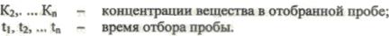 3.3. Расчетный метод определения среднесменной концентрации 3.3.1. Все операции технологического процесса, их длительность (включая нерегламентированные перерывы), длительность отбора каждой пробы и соответствующие ей концентрации вносят в табл. П.9.3 (графы 1,2, 3,4, соответственно). Примечание. Если работник в течение смены выходит из помещения или находится на участках, где заведомо нет контролируемого вещества, то в графе 2 отмечают, чем он был занят, а в графе 5 ставят «0». Результаты произведения концентрации вещества на время отбора пробы вносят в графу 5. 3.3.2. В графу 6 вносят результаты расчета средней концентрации для каждой операции (Ко):