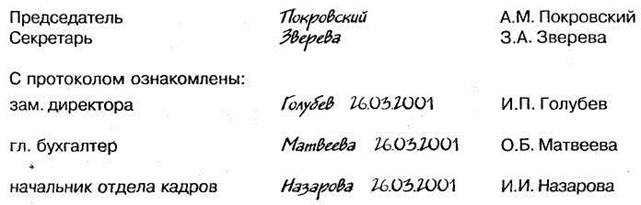 Присутствовали: Гришин М.С., Панкратова И.О., Сергеев Р.И., Яковлев Н.В. ПОВЕСТКА ДНЯ: 1. О ходе рекламной кампании в III кв. 2001 г. Сообщение начальника отдела рекламы Гришина М.С. ___________________________________________________________________________ (Сергеев Р.И., Панкратова И.О.) ПОСТАНОВИЛИ: Одобрить работу отдела рекламы в III кв. 2001г. 2. Об изменениях в системе налогообложения. Сообщение гл. бухгалтера Яковлева Н.В. ___________________________________________________________________________ (Лиходеев Ю.И., Сергеев Р.И.) ПОСТАНОВИЛИ: Принять к сведению информацию об изменениях в системе налогообложения.