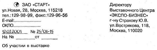 Уважаемый Юрий Викторович! Ознакомившись с рекламой и программой работы Вашего Выставочного Центра, опубликованными в N85 «Экономической газеты» от 15,01.2001, направляем Вам заявку на участие в весенней экспозиции Центра, Просим включить наiу организацию в число участников выставки. Приложение: на 3л, в 2 экз.