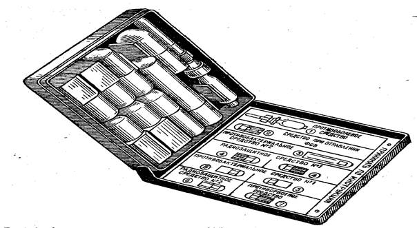 Табельным антидотом в аптечке при поражениях ФОВ является тарен; 1 таблетку тарена принимают по сигналу «Химическая тревога», в случае нарастания признаков отравления необходимо принять еще 1 таблетку (гнездо 2). В гнезде 3 находится большой пенал белого цвета с сульфадиметоксином — противобактериальным средством № 2 (15 таблеток), которое принимают при желудочно-кишечных расстройствах, возникающих после облучения. Для повышения устойчивости организма к ионизирующим излучениям используется радиозащитное средство № 1 (цистамин). Оно находится в гнезде 4 в двух пеналах розового цвета по 6 таблеток в каждом. Средство из этого пенала принимают при угрозе облучения за 30-40 мин в количестве 6 таблеток, запивая водой, а при продолжающемся облучении – через 4-5 ч – еще 6 таблеток. Эффективность средства около 50 %. В гнезде 5 помещены два пенала без окраски с противобактериальным средством № 1 – хлортетрациклином (по 5 таблеток в каждом пенале). Это средство рекомендуют принимать при угрозе или бактериологическом заражении (как средство экстренной неспецифической профилактики, профилактики раневой и ожоговой инфекции). В гнезде 6 находится радиозащитное средство № 2 (йодистый калий), которое принимается по 1 таблетке ежедневно в течение 10 дней после выпадения радиоактивных осадков при опасности попадания радиоактивного йода в организм, особенно с молоком от коров, выпас которых осуществляется на зараженной РВ территории. Для устранения первичной реакции организма на облучение, проявляющейся главным образом тошнотой и рвотой, применяется препарат этаперазин, находящийся в аптечке в пенале синего цвета в гнезде 7. Разовые дозы средства, имеющиеся в аптечке (кроме радиозащитного средства № 2 и противоболевого средства), составляют: детям до 8 лет – 1/4, детям от 8 до 15 лет – 1/2 часть дозы взрослого; разовые дозы радиозащитного средства № 2 и противоболевого средства для детей и взрослых одинаковы. Индивидуальный противохимический пакет (ИПП-8). Используется для частичной санитарной обработки открытых участков кожи и прилегающей к ним одежды при попадании на них капельножидких или туманообразных ОВ, РВ, бактериальных аэрозолей. Этот пакет содержит флакон с полидегазирующей жидкостью, способной обезвреживать ОВ, и 4 ватно-марлевые салфетки. В связи с быстрым проникновением некоторых ОВ, в частности ФОВ, даже через неповрежденные кожные покровы, эффективность дегазации находится в прямой зависимости от сроков начала санитарной обработки. Наибольшая эффективность достигается в случаях, когда частичная санитарная обработка проводится не позднее чем через 5 мин после воздействия ОВ на незащищенные кожные покровы. Индивидуальные перевязочные пакеты. Используются для перевязки ран, ожогов, а также остановки некоторых видов кровотечений.