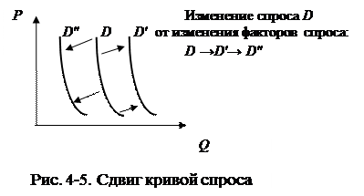 На спрос влияет множество других факторов, помимо цены. Функция спроса (аналитическое представление спроса) - зависимость величины спроса (но не покупок), от цены и других факторов (детерминантов спроса): Qd = f (P,N, I, T, W), (4-2) P - цена данного товара, N - число покупателей, I - денежный доход, T - вкусы, W - ожидания. При изменении факторов спроса, других переменных в формуле (4-2) кроме P, перемещается вся кривая спроса вправо-вверх (увеличение спроса) или влево-вниз (уменьшение спроса), как показано на рисунке 4-5.
