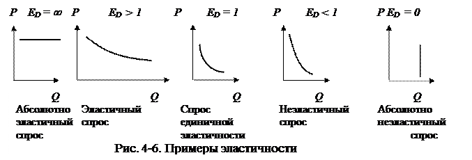 Эластичность спроса по цене выражает чувствительность, реакцию покупателя на изменение цены. Наклон кривой спроса зависит от степени реакции величины спроса на изменение цены, т.е. определяется эластичностью спроса. Для количественной характеристики эластичности спроса служит коэффициент эластичности Ed , он равен отношению процентного изменения величины спроса к процентному изменению цены: Ed = Q [%] / P [%]. Он может быть определен двумя способами: точечная эластичность: Ed = (dQ / dP) / (Q0 / P0); дуговая эластичность: Ed = ((Q2-Q1)/ Qср) / ((P2-P1)/ Pср), где Pср = (P2+P1)/2. Хотя коэффициент эластичности спроса – величина отрицательная, часто в анализах используется его положительное значение (по модулю). Существуют следующие характеры спроса и соответствующие им коэффициенты эластичности, показанные на рисунке 4-6.
