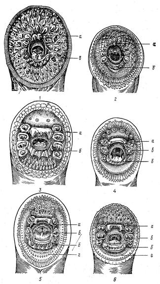 Рисунок 1 – Схема ротовых воронок миног: 1 – морская минога; 2 – каспийская минога; 3 – трехзубая минога; 4 – речная минога; 5 – тихоокеанская минога; 6 – сибирская минога; а – верхнечелюстная пластинака; б – нежнечелюстная пластинка; в – боковые средние губные зубы; г – нижнегубные зубы.