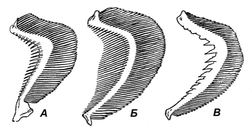 Рис. 2. Жаберные тычинки планктоноядных и хищных рыб А – невский сиг; Б – муксун; В – судак