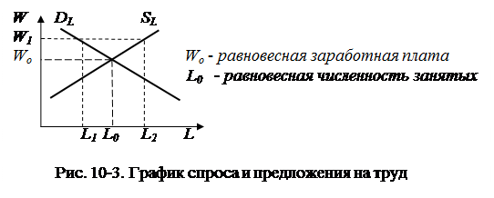 Классическая модель: Труд является одним из факторов производства и выступает на рынке в качестве товара, поэтому для него тоже можно построить графики спроса и предложения на труд, см. рис. 10-3. В качестве количества здесь выступает численность работников L, в качестве цены W - заработная плата (Wage).