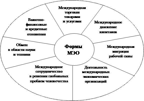 Тема 23. Международная экономика Основные понятия Социальная политика, цели социальной политики, источники доходов, причины неравенства доходов, уровень жизни, показатели уровня жизни, “потребительская корзина”, прожиточный минимум, средний доход, кривая Лоренца, коэффициент неравенства доходов, коэффициент Джини, рыночный метод социальной политики, нерыночный метод социальной политики, социальное равенство, социальная справедливость, социальная защита, источники финансирования социальной политики, центры занятости 1 Система современных международных экономических отношений (МЭО) 2 Внешняя торговля и торговая политика 4 Валютный курс и Паритет покупательной способности 1 Система современных международных экономических отношений Система МЭО включает международный обмен товарами, услугами, факторами производства (рабочей силой и капиталом), валютно-финансовую сферу, сферу научно-технического и производственного сотрудничества. МЭО проявляются в разных формах (см. рис. 23-1). Все формы МЭО взаимосвязаны. Например, торговля товарами сопровождается обеспечением транспортных, финансовых, страховых услуг. Торговля товарами и услугами составляет наибольшую часть (около 80%) общих расчетов между странами (если не считать спекулятивное перемещение валютных средств). Однако наиболее динамично развивается сегодня международное движение капитала.