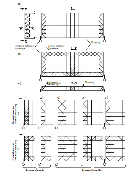 2.3. Фермалар арасындағы вертикаль байланыстар Фермалар арасындағы вертикаль байланыстар көлденең байланыс бар жерде орналасады. Пролеттің еніне қарай оларды 12-15м аралыққа орналастырады (2.1в-сурет).