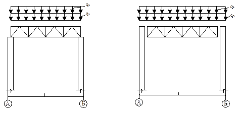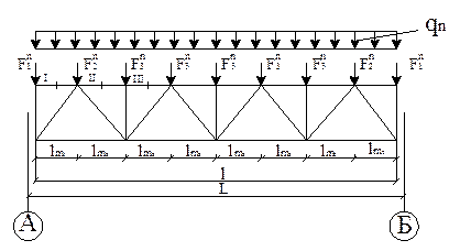 Мұнда qS – рама беларқасына погонды тұрақты жүктеме; qn – рама беларқасына погонды қар жүктемесі. Тұрақты және қар жүктемесінен беларқаның және түйіндік күштердің геометриялық схемаларының симметриялығына байланысты күш диаграммасын тек беларқаның жартысына ғана тұрғызуға болады (4.1-сурет).