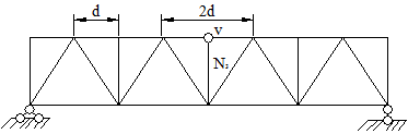 Ферманың берілген есептік схемасы үшін 7.4, 7.5, 7.6-суреттер және 7.1-кесте қажет: әсер сызығы сызылады, одан оңырақ кесілген панельдің участогы ғана қолданылады; в) жүк кесілген панельдің аралығында – құрылған әсер сызығының оң және сол участоктарының шеттерінің екі нүктесі өзара қиылысады (арқалық үшін түйіндік берілу ережесі бойынша). Фермада күш әсер сызығын құруда ең мақсатқа лайықтырағы Риттер тәсілі болып табылады. Түйіндерді кесіп алу және проекция әдісіне тілік белгісіз күшті екі стержень арқылы өтсе ғана жүгінеді, бұл кезде Риттер әдісі қолданылмайды. Түйіндерді кесіп алған кезде екі кесілген панель немесе бір үлкен панель шығуы мүмкін екенін айта кеткен жөн. Әдетте ол егер фермада тор үшбұрышты бағанмен болғанда шығады (7.3-сурет). N3 бағанының күш әсер сызығын тұрғызу үшін (жоғарымен жүру кезінде) V түйіні кесіп алынады, яғни белдеудің төртінші және бесінші панельдері кесіледі (сол тіректен санағанда). Бұл жағдайда «а», «б», «в» кезеңдері былайша оқылады: жүк кесілген үлкен панельдің сол жағында, жүк дәл сол панельдің оң жағында және жүк панельде – N3 баған үстінде. Жоғарымен жүру Үлкен панель
