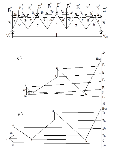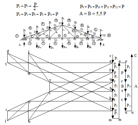 4.1-сурет. Тұрақты және қар жүктемесінен болатын күштер диаграммасы а) трапециялы ферма үшін б) параллель белдеуді фермалар үшін 1. Барлық стерженьдер цифрлік индексті әріппен белгіленеді, мысалға: жоғарғы белдеу О1, О2 және т.с.с., төменгі U1, U2 және т.с.с., қиғаш тіректер D1, D2 және т.с.с., және де номерлеу сол тіректен оң тірекке қарай жүреді. 2. Түйіндерге түсетін күштер Р1, Р2 және т.с.с. белгіленеді. 3. Күштер мен стерженьдер арасындағы немесе стерженьдер арасындағы участоктар басты әріптермен белгіленеді: С, Е, F жіне т.с.с.. 4. Тірек реакциясын анықтау үшін күштік көпбұрыш құрастырылады, онда сағат тілінің бағытымен (немесе оған қарама-қарсы) сол тіректен айналып өтіп барлық сыртқы күштер алып тасталынады. Мұнда әр сыртқы күш екі белгілеу алады, мысалы, Р1 – СЕ болып та оқылады, өйткені ол С және Е участоктарын бөліп тұрады (егер 1 түйінінің айналып өтуі сағат тілінің бағытымен болса). Егер айналып өту сағат тіліне қарама-қарсы болса, онда Р1 – ЕС болып оқылады. 5. Күштіктен кейін жіптік көпбұрыш құрастырылады, оның тұйықталуынан кейін тірек реакцияның өлшемін графикалық (күштік көпбұрышта) анықтауға болады. 6. Егер фермаға жоғарғы белдеуден тек вертикальді жүктемелер әсер етсе, онда 4 пен 5 бөлімдегілер жеткілікті.