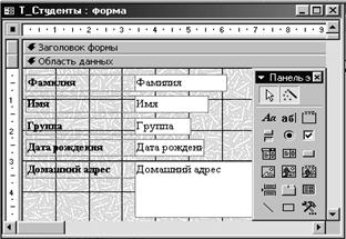 Рис. 2.9. Структура Формы и панель Элементов. Разделы заголовка и примечания имеют чисто оформительское назначение – их содержимое напрямую не связано с таблицей или запросом, на котором основана форма. Раздел данных имеет содержательное значение – в нем представлены элементы управления, с помощью которых выполняется отображение данных или их ввод. Разработчик формы может разместить здесь дополнительные элементы управления для автоматизации ввода данных (переключатели, флажки, списки). Элементы управления формы представлены на панели Элементов, открывающейся щелчком на соответствующей кнопке панели инструментов Access или командой Вид/Панель элементов. Выбор элемента управления выполняется щелчком на его значке в панели Элементов, после чего следующим щелчком в поле формы отмечается место, куда он должен быть поставлен. Вместе с элементом в поле формы вставляется его присоединенная надпись. По умолчанию эта надпись стандартная Переключатель 1, Переключатель 2. Редактировать свойства элемента можно через контекстное меню. Основными элементами оформления формы являются текстовые надписи и рисунки. Для создания в форме текстовых надписей служат два элемента управления – Надпись и Поле. В качестве Надписи можно задать произвольный текст. Элемент Поле отличается тем, что в нем отображается содержимое одного из полей таблицы, на которой основана форма, т.е. при переходе от записи к записи текст изменяется. Для создания графических элементов оформления служат элементы управления: 1. Рисунок выбирается из графического файла и вставляется в форму; 2. Свободная рамка объекта – это не обязательно рисунок, может быть любой другой объект OLE. 3. Присоединенная рамка объекта в какой-то степени может служить для оформления формы, но его содержимое берется не из назначенного файла, а непосредственно из таблицы базы данных (если она имеет поле объекта OLE). При переходе между записями содержимое этого элемента будет меняться.