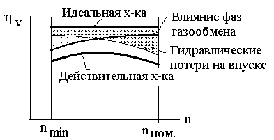 2.2. Х А Р А К Т Е Р И С Т И К И Н А П О Л Н Е Н И Я Д И З Е Л Е Й. Скоростные характеристики изменения коэффициента наполнения дизеля определяются гидравлическими потерями на впуске, которые растут с ростом скорости движения заряда на впуске, а следовательно, частоты вращения вала, а также потерями заряда из – за влияния фаз газораспределения (рис. 2.5).