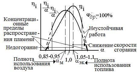 Итак, скоростные характеристики ДсИЗ по механическому КПД (ηм.) существенно отличаются от аналогичных характеристик дизеля. Индикаторный КПД определяется прежде всего величиной коэффициента избытка воздуха: Регулирование такого двигателя производится изменением положения дроссельной заслонки (