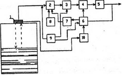 Общая структура волнового радарного уровнемера включает: излучатель сигнала 1, генератор электрических импульсов 9, усилитель-формирователь 2, схему измерения времени 3, ячейку сравнения 4, усилитель 5, элемент обратной связи 6, блок температурной компенсации 10, помехозащищающее устройство 7, блок контроля работоспособности схемы 8. Генератор вырабатывает микроволновые наносекундные радарные импульсы малой мощности направляются вниз по зонду, погруженному в технологическую среду. Когда радарный импульс достигает среды с другим коэффициентом диэлектрической проницаемости, часть энергии импульса отражается в обратном направлении. Разница во времени между моментом передачи радарного импульса и моментом приема эхосигнала пропорциональна расстоянию, согласно которому рассчитывается уровень жидкости. Интенсивность отраженного эхосигнала зависит от диэлектрической проницаемости среды. Чем выше коэффициент диэлектрической проницаемости, тем выше интенсивность отраженного сигнала. Волноводная технология имеет ряд преимуществ по сравнению с другими методами измерений уровня, поскольку радарные импульсы практически невосприимчивы к составу среды, атмосфере резервуара, температуре и давлению.