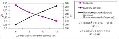 Рис. 4. Аппроксимация исходных данных Построим графики по данным из табл. 2, полученным. В качестве оси абсцисс будет выступать модельное время (часы активной работы, рис. 4), а оси ординат будут отражать динамику изменения данных в свих шкалах: скорость перемещения в метрах за секунду, а ёмкость аккумуляторной батареи в Ватах. Из графика видно, что в исходных данных (ось абсцисс) содержатся значения, не соответствующие шагу моделирования (поэтому при построении графика использовался тип диаграммы «точечная»). Так как требуется оценить возможности АНПА за каждый час работы из исследуемого интервала, то необходимо получить значения рядов данных на каждом шаге моделирования. Осуществим предобработку исходных данных. Для этого выясним закон, которому подчиняются линии с рис. 4, добавив к каждому ряду данных линию тренда. В настройках линии тренда необходимо выбрать её тип и параметры визуализации (в частности, вывести на диаграмму её уравнение и показатель достоверности аппроксимации Получив уравнения кривых скорости и ёмкости, пересчитаем по ним табличные данные с нужным шагом, то есть в точках 6, 7, …, 16. Результаты нормирования представлены на рис. 5 и в первых трёх строках табл. 3. Разница между данными из табл. 2 и табл. 3 объясняется возникшей в процессе пересчёта погрешностью, так показатель достоверности аппроксимации не равен единице, но к ней стремится. Если учесть, что в качестве шага моделирования был выбран час, а не минута, то данное расхождение существенно не повлияет на результаты расчета.