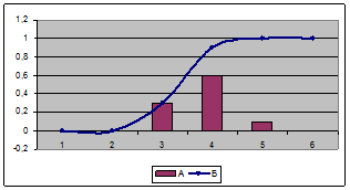 Рис. 16. Функция вероятностей (А) и распределения (Б) Вынесем в отдельную строку таблицы (пятая) значения плотности с накоплением. Получим ряд, называющийся функцией распределения: она показывает, какова для выбранного диапазона вероятность появления событий, меньших либо равных Для составления функции, имитирующей полученное распределение в MS Excel, воспользуемся датчиком случайных чисел: запишем в ячейку А1 формулу «=СЛЧИС()». Теперь составим формулу, имитирующую случайную величину, подчиняющуюся данному закону: «=ЕСЛИ(А1>0,9; 4+СЛЧИС(); ЕСЛИ(А1>0,3; 3+СЛЧИС(); 2+СЛЧИС()))». Добавление к каждому сегменту условия слагаемого СЛЧИС() обусловлено тем, что значения моделируемого ряда должны быть дробными. Вывод: функция вероятностей дискретной случайной величины по расходу бензина представлена на рис. 16. Формула, имитирующая данное распределение, была приведена выше. Приведённый подход к генерации дискретной случайной величины по таблице или функции распределения называется методом обратной функции. Для оценки дискретных случайных величин используются некоторые теоретические распределения. Перечислим некоторые из них, отметив их назначение: • распределение Пуассона – применяется для вычисления вероятности появления случайных событий при заданной интенсивности их появления в единицу времени; • биномиальное распределение – применяется для вычисления вероятности числа удачных событий из фиксированного объёма серии экспериментов при заданном значении априорной вероятности; • распределение Бернулли – применяется для вычисления вероятности появления одного исследуемого значения события в одиночной реализации случайного процесса (частный случай биномиального распределения); • гипергеометрическое распределение – применяется для вычисления вероятности числа меченых элементов в выборке фиксированного объёма из исследуемой совокупности.