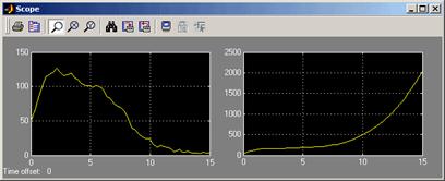 Рис. 27. Блочная модель, составленная в библиотеке Simulink Взаимодействие между подсистемами проявляется в виде связей между двумя изолированными контурами, дополненными блоками «преобразователь» (Gain), которые соответствуют элементу «темп» диаграммы потоков. В качестве параметров аналогового модельного времени зададим следующие значения: начальное время – 0, конечное время – 12, шаг моделирования – переменный (Variable-Step). Начальные значения спроса для каждой подсистемы устанавливаются в блоке Integrator(свойство Initial condition). Выведем объёмы продаж каждого напитка на график, используя блок Scope. Результаты моделирования представлены на рис. 28.
