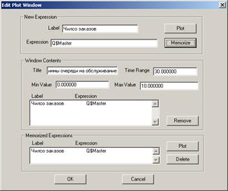 Таким образом, можно выделить следующие параметры накопителя: • время окончания моделирования – 480 минут; • число блоков – 19. Для каналов обслуживания Master1 и Master 2: • число входов – 45 и 33; • коэффициент использования – 0.901 и 0.875; • среднее время обслуживания – 9.608 и 12.734. Параметры очередей Master и Total_Time: • максимальное содержание – 10 и 12; • число входов – 83; • среднее число входов – 3.494 и 5.271. Для создания графика заполним поля окна Edit Plot Window (рис. 35). В результате просчёта будет выведено окно (рис. 36).