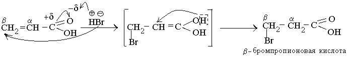 связи. По двойной связи – наиболее характерны: 1 ) реакциибромирования СН2 =СН–СООН + Вr2 ВrСН2 –СНВr –СООН a,b -дибромпропионовая кислота 2) реакции с кислотами