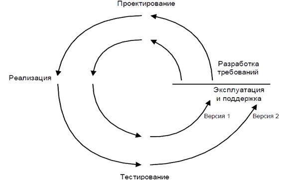 Рисунок 4. Спиральная модель ЖЦ разработки Итеративная разработка отражает объективно существующий спиральный цикл создания сложных систем. Она позволяет переходить на следующий этап, не дожидаясь полного завершения работы на текущем (за счёт частичной реализации функциональности программного продукта) и решить главную задачу - как можно быстрее показать пользователям системы работоспособный продукт, тем самым активизируя процесс уточнения и дополнения требований с их стороны. Основная проблема спирального цикла – определение критерия перехода на следующий этап. Для её решения могут вводиться временные ограничения на каждый из этапов жизненного цикла, и переход осуществляется в соответствии с планом, даже если не вся запланированная работа закончена. Планирование производится на основе статистических данных, полученных в предыдущих проектах, личного опыта разработчиков и результатов анализа предшествующих итераций. Стоит различать понятие модели ЖЦ программного обеспечения и собственно жизненный цикл конкретного программного продукта. Конкретный ЖЦ обычно использует различные модели для различных компонент проекта. Некоторые компоненты могут быть заимствованы их предшествующих проектом или приобретены на рынке ПО, другие — проходят итерационный спиральный или каскадный ЖЦ. Кроме того следует отличать ЖЦ разработки ПО, который описывает именно процессы разработки и ЖЦ самого ПО. В жизненном цикле проекта (разработки) присутствуют такие этапы, как формирование и обучение коллектива, закупка оборудования, создание стендов отладки и тестирования. ЖЦ программного продукта определяет, в свою очередь, процессы, связанные с функционированием самой программы, такие как: - установка/настройка; - эксплуатация; - обновление; - резервное копирование; - временный останов; - вывод из обращения. Таким образом, можно и нужно говорить и о таком понятии, как ЖЦ проекта разработки ПО, который обычно на фазе инициализации включает в себя и подписание контракта с заказчиком, приобретение лицензий на инструментальное ПО, формирование среды информационной поддержки проекта, подбор и обучение персонала и т.п.