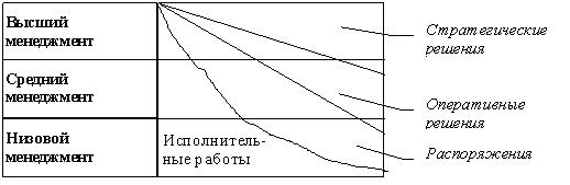Большинство фирм имеют три уровня управления: верхний, средний и нижний. Толчок к разделению управления на верхний, средний и нижний уровни дала промышленная революция в Европе в XVIII в. Сначала выделились верхнее и нижнее звенья управления. Слово «мастер» стало страшным и ненавистным. Мастера чаще подбирались по физическим данным, чем по умению обходиться с людьми. Среднее звено вычленилось по мере увеличения размеров и сложности фирм, более осмысленного подхода к управлению. Управляющие каждого уровня выполняют одинаковые функции: планирование, организация, руководство, мотивация, контроль. Различие лишь в том, какое значение они придают той или иной функции. Руководитель верхнего уровня уделяет планированию и организации больше времени, чем управляющие более низких уровней. Управляющий среднего уровня уделяет руководству и контролю больше времени, чем управляющий верхнего уровня. Управляющий нижнего уровня расходует большую часть своего времени на мотивацию и контроль подчиненных. Тем не менее, большинство управляющих выполняют все пять функций управления (планирование, организация, мотивация, контроль и координация). Итак, нельзя порознь изучать или осваивать функции управления верхнего, среднего или нижнего уровня. Когда говорят об одном из них, по существу, речь идет обо всех трех. Следует подчеркнуть, что ясно и четко определить каждый из трех уровней управления невозможно, т.к. каждая фирма определяет уровни управления в соответствии со своими особенностями. Здесь, вероятно, следует напомнить о влиянии следующих факторов: сложность организационной структуры, численность работающих, суть самого бизнеса и др. Управляющие верхнего уровня средних и крупных фирм концентрируют внимание на планировании будущего, постановке целей, определении курсов действий, правил и процедур их выполнения. Они отвечают за процветание фирмы и потому должны планировать, направлять и контролировать ее деятельность. К верхнему уровню управления относят президента и вице-президентов. Понятно, что в фирме могут быть несколько вице-президентов, ответственных за отдельные сферы ее деятельности - производство, сбыт, снабжение, финансы, кадры или рекламу. Управляющие среднего звена возглавляют отделения или отделы. Они должны организовать их работу так, чтобы цели фирмы были достигнуты, а ее политика проводилась в жизнь, подбирать и сохранять хороших работников. Они отвечают, в основном, за руководство повседневной деятельностью своих подразделений. К среднему уровню руководства относятся управляющие конторами, цехами и складами, старшие мастера, начальники отделов технического контроля и качества продукции. Во многих крупных банках их филиалами руководят вице-президенты. Они отвечают за работу отделений банка и относятся к руководителям верхнего уровня. Управляющий отделением непосредственно подчинен вице-президенту по операциям отделений и относится к управляющим среднего уровня. Нижний уровень управления – это уровень должностных лиц, непосредственно руководящих работой своих подчиненных. На этом уровне функции планирования и организации реализуются в действиях управляющего, стимулирующего и направляющего деятельность работников. Типичные наименования должностей, занимаемых управляющими этого уровня: мастер, бриг