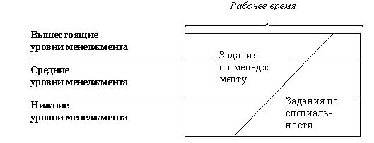 Такое распределение общего бюджета времени связано с тем, что менеджеры всех трех уровней имеют две области заданий: задания по менеджменту и задания по специальности (рис. 3). Это значит, что руководитель любого уровня управления определенный процент времени тратит на принятие управленческих решений и определенный – на принятие решений по специальности. Как видно на рис. 3, с повышением уровня управления удельный вес заданий по специальности падает, а по менеджменту, соответственно, возрастает.