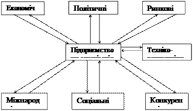 Рис. 4 Схема взаємодії підприємства із зовнішнім середовищем (фактори впливу) Провівши аналіз зовнішнього середовища і одержавши дані про фактори, які аналізують небезпеку чи відкривають нові можливості керівництво, повинне оцінити: чи володіє організація внутрішніми силами, щоб скористатися можливостями, і які внутрішні слабкі можуть ускладнити майбутні проблеми, пов’язані з зовнішніми небезпеками. Для цього і здійснюється управлінське обстеження організації (підприємства). Управлінські обстеження – це методична оцінка сильних і слабких сторін діяльності організацій (підприємства) з метою виявлення її шансів у конкурентній боротьбі в обраній сфері діяльності. Сильні сторони є перевагами, які організація використовує у конкурентній боротьбі та прагне максимально зміцнити. Слабкі сторони – це є недоліки в діяльності організації, що загрожують її розвитку, які повинні перебувати під постійним контролем з метою їх усунення. Ведучи управлінське обстеження, ми здійснюємо аналіз внутрішнього середовища організацій. Внутрішнє середовище – це сукупність процесів та елементів організацій, стан яких в поєднанні визначає той потенціал і ті можливості якими володіє організація. Внутрішнє середовище визначається ситуаційними факторами в середині організації. Управлінське обстеження ведеться у таких напрямках: 1. Аналіз та оцінка маркетингової діяльності здійснюється відповідно до таких критеріїв: - доля ринку; - різноманітність і якість асортименту; - ринкова демографія; - рівень конкурентоспроможності продукції; - ефективний збут і просування товару на ринки; - рівень цін і механізм ціноутворення. 2. Аналіз і оцінка фінансового стану – передбачає визначення ефективності використання і руху грошових засобів в організації і здійснюється у таких напрямках: - прибутковість; - забезпеченість позичковим і власним капіталом; - оборотність капіталів; - ліквідність підприємства. 3. Аналіз і оцінка виробничо-господарської діяльності підприємства ведеться відповідно до таких критеріїв: - оцінюється витратний механізм порівняно з конкурентами; - залежність від постачальника сировини і комплектуючих матеріалів; - рівень обслуговування технологічного парку; - наявність ефективної системи контролю за якістю продукції; - оцінюється виробничі потужності підприємства; - рівень організації виробничого процесу. 4. Аналіз управлінського потенціалу організації полягає в оцінці професійного рівня і досвіченості керівників в організації, зіставлені обраної організаційної структури управління підприємством та обраної стратегії; оцінці норм, правил, процедур, розподілу прав і відповідальності, ієрархії підпорядкування. 5. Аналіз і оцінка кадрового потенціалу охоплює такі процеси, як: взаємодію менеджерів і підлеглих, найм, навчання і просування кадрів, оцінку результатів праці, рівень мотивованості працівників, відповідність віку і статі, освіти, рівня кваліфікації, досвіду виконуваним роботам на певній посаді. 6. Оцінка організаційної культури і іміджу підприємства. Під організаційною культурою розуміють систему сформованих в організації моделей поведінки, звичаїв, моралі, традицій тощо. Оцінити організаційну культуру можна згідно таких критеріїв: - побудова системи кар’єри в організації і якими критеріями керуються менеджер
