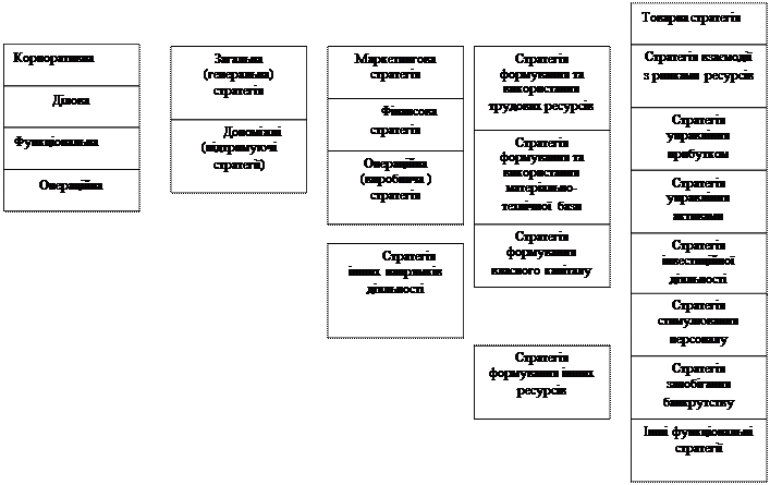 Рис. 5 Класифікаця видів стратегій Реалізація стратегій здійснюється у двох напрямках: - з використанням адміністративних важелів на основі тактики, політики, процедур та правил; - за допомогою економічних важелів шляхом формування бюджету, застосування системи показників та управління за цілями.