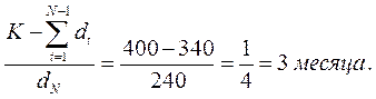 Алгоритм расчёта срока окупаемости 1) Определение первой суммы последовательных доходов, превышающей размер капиталовложений. N = 4. N – Число лет за которое окупится проект. 2) Целая часть срока окупаемости. Целая часть срока окупаемости равна N – 1. N – 1 = 4 – 1 = 3. 3) Дробная часть срока окупаемости рассчитывается по формуле:.