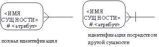Рис. 46. Каждый атрибут идентифицируется уникальным именем, выражаемым грамматическим оборотом существительного, описывающим представляемую атрибутом характеристику. Атрибуты изображаются в виде списка имен внутри блока ассоциированной сущности, причем каждый атрибут занимает отдельную строку. Атрибуты, определяющие первичный ключ, размещаются наверху списка и выделяются знаком "#". Каждая сущность должна обладать хотя бы одним возможным ключом. Возможный ключ сущности - это один или несколько атрибутов, чьи значения однозначно определяют каждый экземпляр сущности. При существовании нескольких возможных ключей один из них обозначается в качестве первичного ключа, а остальные - как альтернативные ключи. С учетом имеющейся информации дополним построенную ранее диаграмму (Рис. 47). Помимо перечисленных основных конструкций модель данных может содержать ряд дополнительных. Подтипы и супертипы: одна сущность является обобщающим понятием для группы подобных сущностей (Рис. 48). Взаимно исключающие связи: каждый экземпляр сущности участвует только в одной связи из группы взаимно исключающих связей (Рис. 49).