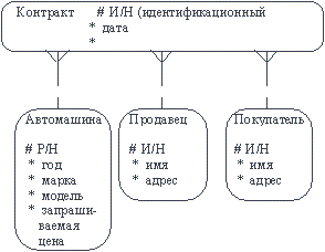 Виды нотаций ER-диаграмм Конечно, представленный выше способ представления ER-диаграмм не является единственным. В этом подразделе мы представляем несколько других нотаций. Нотация ER-диаграммы была впервые введена П. Ченом (Chen) и получила дальнейшее развитие в работах Баркера. Метод Баркера будет излагаться на примере предметной области компании по торговле автомобилями. Сущность (Entity) - реальный либо воображаемый объект, имеющий существенное значение для рассматриваемой предметной области, информация о котором подлежит хранению Рис. 41.