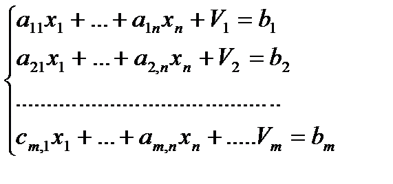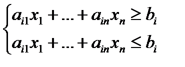 Покажем, что общая задача ЛП может быть сведена как к однородной задаче ЛП, так и к канонической. I. Вначале сведём общую задачу к однородной. В соответствии с определением 1 п.1.3 для этого достаточно каждое ограничение вида равенства: