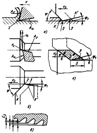 На значения кинематических геометрических параметров влияет положение вектора скорости ve результирующего движения резания, т. е. угол η и величина и направление вектора скорости подачи vs. Форма и элементы слоя материала, срезаемого за один цикл обработки, зависят от подачи S, формы и положения режущей кромки. Положение режущей кромки определяется углом в плане φ. Толщина срезаемого слоя (см. рис. 4, г) a = S·sinφ.