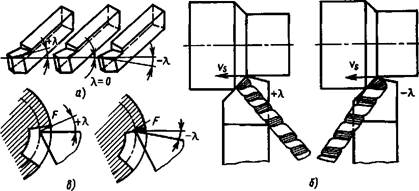 Рис. 3. Угол λ наклона режущей кромки: а — определение угла; б — влияние угла λ на направление отвода стружки; в — влияние угла на положение точки контакта лезвия с обрабатываемой заготовкой