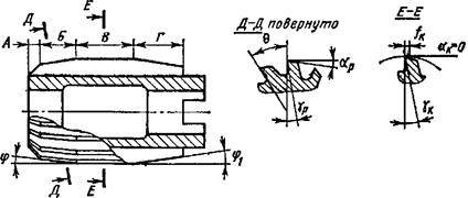 Кроме цилиндрических отверстий, развертками обрабатывают конические поверхности под резьбу, конусы Морзе, метрические конусы, отверстия под конические штифты (рис. 24, д). Геометрию разверток рассмотрим на примере цельной насадной машинной развертки для сквозных отверстий (рис. 25). По длине рабочей части развертки можно выделить участки А — Г различного назначения. Для удобства введения развертки в отверстие служит участок А. Его наличие вызвано малыми глубинами резания, характерными для развертывания, и малыми углами в плане φ < 15°. У разверток для глухих отверстий этот участок может отсутствовать, так как он выполняется совместно с заборным конусом Б. Последний несет режущие элементы, выполняющие основную работу резания. Зуб на этом участке имеет геометрию режущей части с углами γр и αр. Участок В — калибрующий, выполняется цилиндрическим, а участок Г представляет собой обратный конус, чтобы обеспечить высокое качество обработанной поверхности при вынимании развертки из отверстия. На калибрующей части имеется передний γк и задний αк углы. Обычно αк = 0 для сохранения необходимого диаметра развертки при переточках. Это вызвано высокой точностью чистового развертывания (6...9 квалитет) и стремлением увеличить срок службы инструмента.