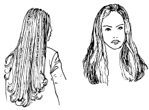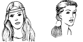 Рис. 37. Прически из длинных волос Нанести на волосы мусс для укладки, позволяющий придать форму прическе. С помощью щипцов для завивки сделать волосы волнистыми. Чтобы добиться эффекта небрежно уложенных волос, нужно растрепать их руками. Удачно дополнить прическу может повязка. Через всю голову провести прямой пробор посередине. Затем осторожно, чтобы верхние пряди оставались гладкими и прямыми, надеть повязку из бисера. Приподнять пряди по бокам, подгибая их так, чтобы они не были туго стянуты, и собрать вместе на затылке. Подвернув концами внутрь, подколоть шпильками. В зависимости от длины волос, прическу можно слегка изменять. Следующая прическа выглядит довольно нарядно и подойдет для особых случаев. Щипцами для завивки волосы нужно сделать волнистыми по всей длине. Уложить их пальцами и собрать в пучок сбоку. Завязать узлом, закрепив шнуром или кожаным ремешком так, чтобы кончики свисали.