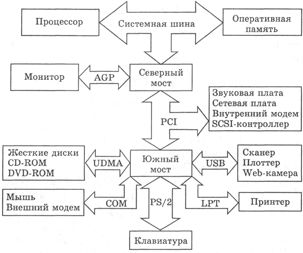 К северному мосту подключается шина PCI (Peripherial Component Interconnect bus - шина взаимодействия периферийных устройств), которая обеспечивает обмен информацией с контроллерами периферийных устройств. Частота контроллеров меньше частоты системной шины, например, если частота системной шины составляет 100 МГц, то частота шины PCI обычно в три раза меньше - 33 МГц. Контроллеры периферийных устройств (звуковая плата, сетевая плата, SCSI-контроллер, внутренний модем) устанавливаются в слоты расширения системной платы. По мере увеличения разрешающей способности монитора и глубины цвета требования к быстродействию шины, связывающей видеоплату с процессором и оперативной памятью, возрастают. В настоящее время для подключения видеоплаты обычно используется специальная шина AGP (Accelerated Graphic Port - ускоренный графический порт), соединенная с северным мостом и имеющая частоту, в несколько раз большую, чем шина PCI. Южный мост обеспечивает обмен информацией между северным мостом и портами для подключения периферийного оборудования. Устройства хранения информации (жесткие диски, CD-ROM, DVD-ROM) подключаются к южному мосту по шине UDMA (Ultra Direct Memory Access - прямое подключение к памяти). Мышь и внешний модем подключаются к южному мосту с помощью последовательных портов, которые передают электрические импульсы, несущие информацию в машинном коде, последовательно один за другим. Обозначаются последовательные порты как СОМ1 и COM2, а аппаратно реализуются с помощью 25-контактного и 9-контактного разъемов, которые выведены на заднюю панель системного блока. Принтер подключается к параллельному порту, который обеспечивает более высокую скорость передачи информации, чем последовательные порты, так как передает одновременно 8 электрических импульсов, несущих информацию в машинном коде. Обозначается параллельный порт как LPT, а аппаратно реализуется в виде 25-контактного разъема на задней панели системного блока. Для подключения сканеров и цифровых камер обычно используется порт USB (Universal Serial Bus - универсальная последовательная шина), который обеспечивает высокоскоростное подключение к компьютеру сразу нескольких периферийных устройств. Клавиатура подключается обычно с помощью порта PS/2.