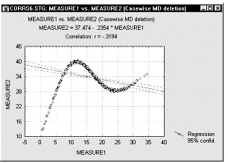 Если вы допускаете такое явление и знаете, как определить "подмножества" данных, попытайтесь вычислить корреляции отдельно для каждого множества. Если вам неясно, как определить подмножества, попытайтесь применить многомерные методы разведочного анализа. Нелинейные зависимости между переменными. Другим возможным источником трудностей, связанным с линейной корреляцией Пирсона r, является форма зависимости. Корреляция Пирсона r хорошо подходит для описания линейной зависимости. Отклонения от линейности увеличивают общую сумму квадратов расстояний от регрессионной прямой, даже если она представляет "истинные" и очень тесные связи между переменными. Итак, еще одной причиной, вызывающей необходимость рассмотрения диаграммы рассеяния для каждого коэффициента корреляции, является нелинейность. Например, следующий график показывает сильную корреляцию между двумя переменными, которую невозможно хорошо описать с помощью линейной функции.