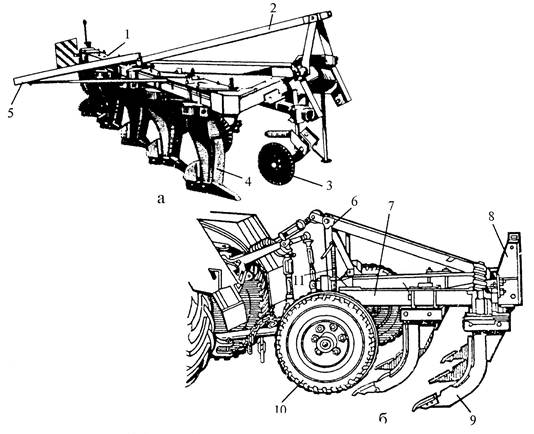 Рис. 1.17. Плуг-розпушувач ПРПВ-5-50 (а) і плуг-глибокорозпушувач чизельний ПЧ-2,5 (б): 1 і 7 - рами; 2 і 6 - начіпки; 3 - дисковий ніж; 4 - робочий орган; 5 - начіпка для борін; 8 - кронштейн для кріплення пристрою ПСТ-2,5; 9 - лапа; 10 - опорне колесо; 11 - гвинтовий механізм