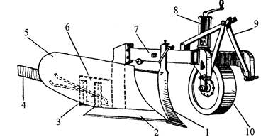 Рис. 1.21. Плуг чагарниково-болотний ПБН-75: 1 — ніж чересловий; 2 - леміш; 3 — польова дошка; 4 — перо; 5 — полиця; 6 — розширювач; 7 - рама; 8 — гвинтовий механізм; 9 — начіпний пристрій; 10 — опорне колесо