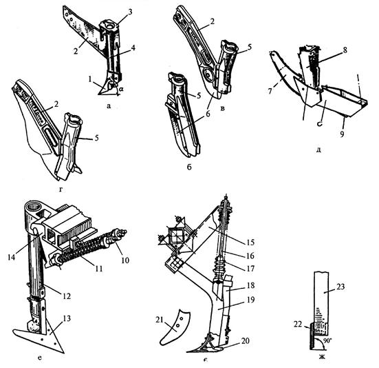 Рис. 3.6. Сошники наральникові: а - анкерний; б — кілевидний сівалки СЗТ-3,6А; в - кілевидний сівалки СЗ-3,6А-03; г — кілевидний льонової сівалки; д — полозовидний комбінований;е і є - стерньових сівалок; ж - трубчастий; 1 - наральник; 2 і 15 - кронштейни; 3 - скоба; 4 і 23 - трубки; 5, 8 - лійки; 6 - кілевидний наральник; 7 - полоз; 9 - п'ятка; 10 - болт; 11 і 17 - пружини; 12 І 19 - стовби; 13 І 20 - лапи; 16 - тяга; 18 - насіннєпровід; 21 і 22 – носки Глибину ходу (4-7 см) анкерних сошників регулюють начіплюванням спеціальних вантажів та зміною кута входження наральника у ґрунт. Кілевидний сошник (рис. 3.6,б,в,г) має в передній частині загострену пластину (кіль) 6, за допомогою якої розсувається ґрунт і утворюється борозна. Кіль сошника переміщує частинки ґрунту зверху вниз і ущільнює дно борозни. Кілевидні сошники роблять вузькі борозни і їх можна використовувати для вузькорядної сівби. Глибину ходу сошника регулюють натискною пружиною або тягарцем. Кілевидні сошники встановлюють на зернотрав'яних, льонових, деяких зернових та інших сівалках. Полозовидний сошник (рис. 3.6,д) має у передній частині ножевидний наральник 7, який переходить у видовжені щоки та клиновидний ущільнювач знизу. Ножевидний наральник і щоки утворюють борозну, а ущільнювач ущільнює її дно. Сошник утворює борозну глибиною до 12 см. Глибину його ходу регулюють переміщенням прикочувального котка. Полозовидний комбінований сошник утворює на поверхні поля послідовно дві паралельні борозни - першу для мінеральних добрив, а другу -для насіння. Полозовидні сошники встановлюють на кукурудзяних, бавовникових, овочевих, рисових та інших сівалках. Лаповий сошник (рис. 3.6,е,є) складається із стрільчастої лапи 13 і трубки. Лапові сошники використовують для сівби зернових по стерні на легких ґрунтах. Лапа підрізує і розпушує ґрунт, а по трубці під лапу подається насіння та мінеральні добрива. Спосіб сівби - рядковий. Лапові сошники застосовують і для смугової сівби. У цьому випадку під лапою встановлюють конусний розподільник. Насіння і добрива надходять до розподільника, який і розподіляє їх у вигляді смуги в ґрунті. Трубчастий сошник (рис. 3.6,ж) складається з трубки 23 і наральника 22. Трубка є насіннєпроводом. Сошник з'єднаний з рамою шарнірно і підпру-жинений. Під час роботи сошник вібрує і сприяє самоочищенню трубок. Трубчасті сошники встановлюють на зернових сівалках для сівби по стерні і на ґрунтах, які піддаються вітровій ерозії. Дводисковий однорядковий (звичайний) сошник складається з двох плоских дисків 1 (рис. 3.7,а), корпуса 4 з розтрубом та повідця 2. До дисків кріпляться фігурні кришки 8, в яких встановлені осі 7 і підшипники 6. Кромка дисків загострена. У передній частині вони сходяться, утворюючи клин із кутом 10°. Зазор між ними повинен бути не менше 1,5 мм. У задній частині корпуса сошника закріплені два чистики і напрямна пластина для спрямування насіння на дно борозни. Між корпусом і дисками встановлені гумові ущільнювачі. Сошник переднього ряду має, здебільшого, плоску напрямну пластину, а заднього ряду - зігнуту, криволінійну. Під час руху сошника диски 1 обертаються, розрізують ґрунт і зміщують його на два боки, утворюючи борозну. Насіння та мінеральні добрива по напрямній пластині спрямовуються на дно борозни. Стінки борозни осипаються і частково присипають насіння та добрива ґрунтом. Внутрішні поверхні дисків о