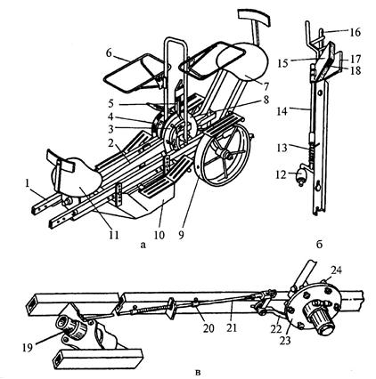 Рис. 3.35. Садильна секція (а), розсадотримач (б) і пристрій для порційного поливання (в) розсадосадильної машини СКН-6А: 1 — рама секції; 2 — кожух приводного ланцюга; 3 - ліве лекало; 4 — праве лекало; 5 -розсадотримач; 6 - полиця для ящиків розсади; 7 - заднє сидіння; 8 - диск садильного апарата; 9 - прикочу вальний коток; 10 - сошник; 11 — переднє сидіння; 12 — ролик; 13 — пружина; 14 - колінчастий стрижень; 15 і 17 - пластини; 16 - знімна вилка для підтримання горщечка; 18 - накладка губчаста; 19 - дозувальний пристрій поливання; 20 - фіксуюча втулка; 21 - тяга повороту заслінки; 22 - важіль; 23 — поливний диск; 24 — штовхаючий ролик