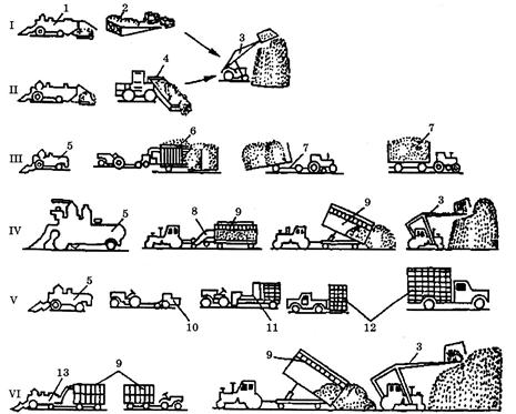 Рис. 6.30. Комплекси машин і технологи збирання соломи: І, II, НІ, IV - збирання соломи без подрібнення; V - збирання соломи з пресуванням у паки або рулони; VI - збирання соломи з подрібненням; 1 - комбайн з копнувачем; 2 - волокуша ВТУ-10; 3 - навантажувач ПФ-0.5Б; 4 - волокуша ВНК-11; 5 - комбайн з пристроєм для укладання соломи у валок; 6 - копицеутворювач СПТ-60; 7 - копицевіз СП-бО; 8 - підбирач-ущільнювач ПВ-6; 9 — причіп тракторний; 10 — прес-підбирач ППЛ-Ф-1,6 або ПРП-1,6; 11 — підбирач паків ГУТ-2.5А; 12 - транспортувальник штабелів ТШН-2,5; 13 — комбайн з подрібнювачем соломи. Ширина захвату підбирача -2м. Робоча швидкість - до 8 км/год. Продуктивність - до 6-8 т/год. Агрегатують із тракторами класу 1,4. Волокуша штовхаюча ВНК-11 призначена для підбирання і транспортування копиць соломи до місця скиртування. Основними складальними одиницями волокуші є днище з підбираль-ними пальцями, дві боковини, рама, начіпний пристрій. Боковини шар-нірно з'єднані з рамою. У робочому положенні боковини розкриті. Ширина захвату -11м. Агрегатують волокушу з тракторами класу 5. Продуктивність волокуші - 7 га/год. Агрегат універсальний УСА-10 призначений для механізованого скиртування соломи у подрібненому або у не подрібненому вигляді. Основні складальні одиниці агрегату: камера для соломи, ущільнювальний механізм важільного типу, чотири гідроциліндри, маслопроводи, чотири опорних пневматичних колеса. Робочий процес агрегату відбувається так. Агрегат встановлюють на майданчик для формування скирти. Завантажують у його камеру солому одним або двома навантажувачами ПФ-0,5Б. Матеріал розрівнюється і ущільнюється в камері шарнірно-важільним механізмом. Після заповнення камери матеріалом ущільнена маса тисне на шарнірно-важільний механізм і агрегат пересувається вперед на 1-1,5 м. Скирти формують заданої довжини. Ширина скирти - 5,5-6,5 м, а висота - 5,6-6,2 м. Агрегатують УСА-10 із тракторами класу 1,4. Продуктивність - до 21,6 т/год.