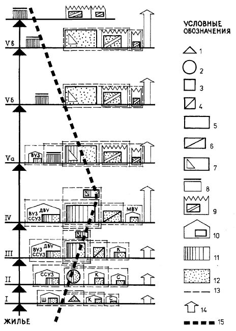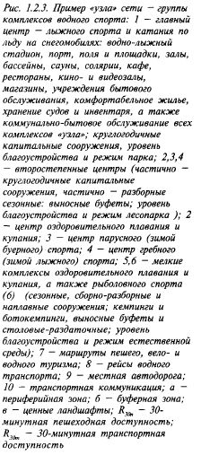 ные и обслуживающие преимущественно учреждения питания), элементы городской инфраструктуры (транспортные устройства, автостоянки). Функциональное объединение осуществляется во внерабочее время — при попутном посещении торгового и бытового учреждений, в свободное время — при попутном посещении культурно-зрелищных и просветительных учреждений. Кооперирование может осуществляться в различных пространственных формах: взаимопроникновение участков сооружений, смежное размещение (блокирование) и размещение на определенном расстоянии кооперируемых объектов. Кооперирование осуществляется по-разному на различных уровнях обслуживания. Физкультурно-спортивные центры жилых районов могут кооперироваться с базовой школой этого района, ПТУ, средним специальным учебным заведением, (ССУЗом), объединяя физкультурно-спортивные сооружения. Это сразу дает относительно развитый состав залов, ванн бассейнов и плоскостных сооружений. Возможна кооперация с садом жилого массива путем объединения озелененных территорий; кооперация с клубом и кинотеатром (образуется культурно-спортивный комплекс КСК) и другие. Физкультурно-спортивные центры планировочных районов могут кооперироваться с ПТУ, ССУЗами, вузами или учебным центром, образованным ими на основе объединения физкультурно-спортивных сооружений, что дает возможность сразу получать такие крупные сооружения, как манежи для легкой атлетики, специализированные спортзалы и ванны бассейнов. Можно кооперироваться с парком, объединяя физкультурно-спортивные сооружения и создавая специализированные сооружения для физкультурно-оздоровительных занятий, а также с кинотеатром, клубом, домом культуры, с предприятиями общественного питания, с административными учреждениями и другими. Границы и формы кооперирования общегородских физкультурно-спортивных центров зависят от размеров города. Объединение с учебными заведениями наиболее целесообразно для городов малых и средних. Такое объединение менее целесообразно для крупных и тем более - крупнейших городов, где учебные и физкультурно-спортивные центры имеют свой развитый состав сооружений. Основные предпосылки кооперирования загородных физкультурно-спортивных комплексов: размещение вне городской инфраструктуры, из-за чего высок удельный вес технических, коммунальных и транспортных сооружений, общественного обслуживания и жилья; размещение комплексов группами (узлами) у мест пересечения рекреационных территорий коммуникациями; сезонный характер профилирующих занятий по большинству видов спорта, зависящих от местных условий (рис. 1.2.3).