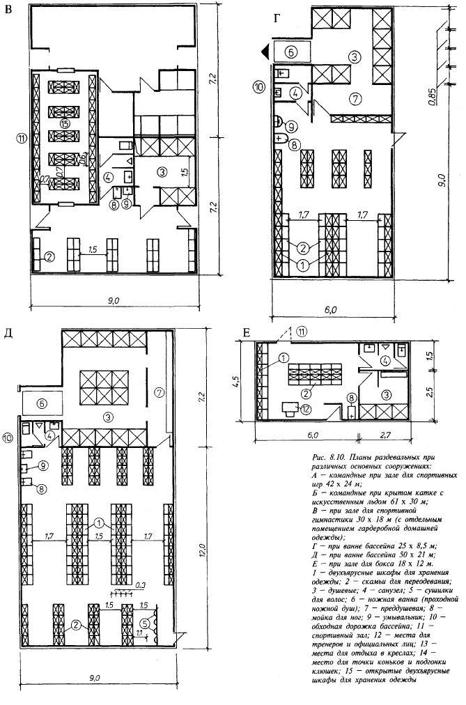 222 ФИЗКУЛЬТУРНО-СПОРТИВНЫЕ СООРУЖЕНИЯ В крытых катках с искусственным льдом, предназначаемых для учебно-тренировочных занятий и соревнований по хоккею, требуются помещения для сушки спортивной одежды и обуви хоккеистов площадью 7 м2 на каждую команду. Исходя из практики, при одной площадке (61 х 30 м) рекомендуется 10 сушилок. На сооружениях для проведения сборов или кустовых соревнований с участием большого числа команд число помещений определяется заданием на проектирование. Помещения для сушки рекомендуется размещать в удобной связи с раздевальными, на пути в раздевальные от входа в здание. На каждом катке есть "своя" команда, которой отдается в постоянное пользование одна из раздевальных; помещение для сушки спортивной одежды и обуви хоккеистов этой команды рекомендуется располагать смежно с этой раздевальной, чтобы они сообщались непосредственно. Кроме раздевальных в группу вспомогательных помещений для спортсменов входят помещения для отдыха, принятия пищи и реабилитации. Помещения для отдыха принимаются из расчета 3 м2 на занимающегося, исходя из 15 % единовременной пропускной способности, но они не должны быть менее 24 м2. Помещениями для отдыха могут служить световые разрывы коридоров. Желательны помещения для занятий спортивных клубов по интересам, видеосалоны, детские игровые комнаты. Состав и площади помещений для проведения досуга и общения устанавливаются в каждом случае отдельно в задании на проектирование. На спортивных сооружениях необходимы буфеты для занимающихся. В сооружениях микрорайонов, а также при пропускной способности залов или бассейна менее 48 человек в смену буфеты для занимающихся могут заменяться стойкой для электросамовара с подсобным помещением для хранения и мытья посуды площадью 4 - 8 м2. Число мест в буфетах для занимающихся определяется из расчета 1 посадочное место на 6 человек суммарной пропускной способности в смену. Площади буфетов для занимающихся определяются исходя из следующего расчета: - площадь зала с раздаточной — 3,4 м2 на каждое посадочное место при их числе до 8 и по 1,25 м2 на каждое посадочное место сверх 8. В спортивных сооружениях для медицинского обслуживания должен быть кабинет врача площадью 14 м2 с площадью для ожидания 9 м2 (ею может служить расширение коридора). На спортивных комплексах из нескольких спортивных корпусов кабинет врача (с комнатой для ожидания) нужен только в одном здании, а в остальных — комнаты первой медицинской помощи по 9 м2 каждая. При бассейнах дополнительно вводится комната дежурной медицинской сестры площадью 9-12 м2 с непосредственным выходом на обходную дорожку. При нескольких ваннах, расположенных изолированно друг от друга, комнаты медицинской сестры необходимы при каждой ванне (кроме ванн для обучения детей). В бассейнах с несколькими ваннами кабинет врача с комнатой для ожидания могут быть общими для всего бассейна. Лабораторию химического и бактериологического анализа воды площадью 8-10 м2 желательно размещать в месте, удобно связанном с ванным залом.