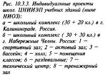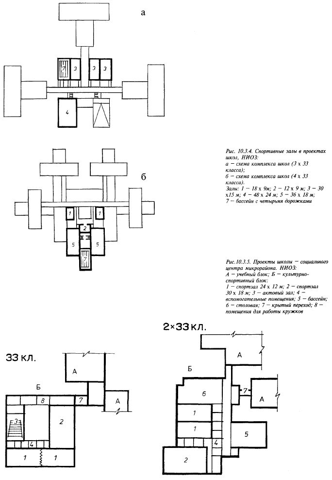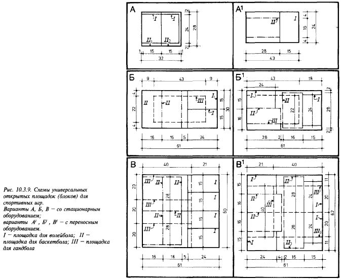 ны планировочные варианты размещения площадок в блоке; блоки рассчитаны либо на стационарное, либо на переносное оборудование (рис. 10.3.9). Площадки для гимнастики размещаются отдельно, так как их оборудование стационарное и зимой их использовать нельзя. Плоскостные сооружения школ можно успешно кооперировать с физкультурно-спортивными площадками микрорайона, создавая единый комплекс. Такой комплекс может быть расположен и не при школе, тогда действует правило размещения площадок — не далее 300 м от вспомогательных помещений.