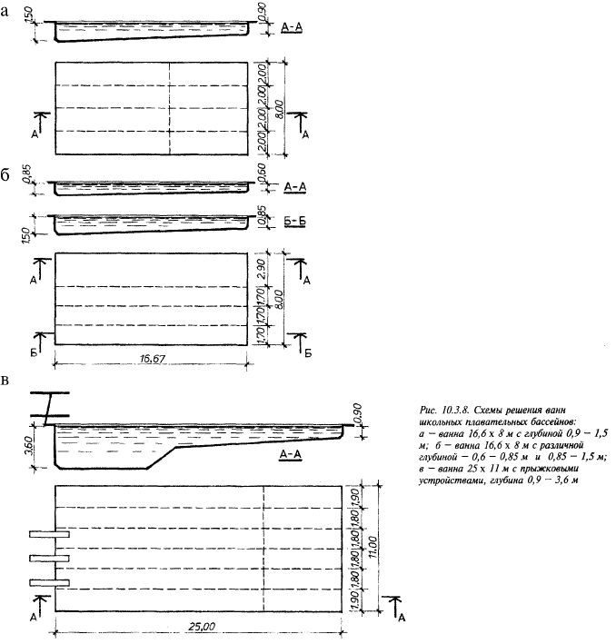 или 12,5 х 6 м с глубиной воды 0,6 - 0,85 м) и для совершенствования навыков плавания (25-метровая с глубиной воды 1,2 - 1,45 м) (рис. 10.3.7). Если невозможно или нецелесообразно строить сооружения с двумя-тремя ваннами, можно ограничиться одной ванной с переменным уровнем воды или специальным профилем дна (рис. 10.3.8). Ширина дорожки школьного бассейна может быть меньше, чем спортивного: по 1,8 м средние дорожки и по 1,9 м - крайние. В программе физического воспитания для средних школ нет занятий прыжками в воду, однако в крупных школьных комплексах можно устраивать одну трехметровую вышку и два однометровых трамплина как развлекательные устройства. При этом требуется местное увеличение глубины воды до 3,6 м. Зал подготовительных занятий не обязателен: разминка перед занятия- КОМПЛЕКСЫ ФИЗКУЛЬТУРНО-СПОРТИВНЫХ СООРУЖЕНИЙ______________________________________________________ 291