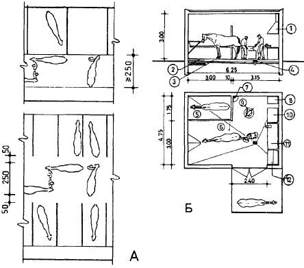 Лошади нужно много места для движения, в связи с чем размеры денников обычно ограничиваются экономическими соображениями и принимаются 3х4;4х3;3,5x3,5;3х3,5мв зависимости от шага конструкций. Параметры рассчитаны на лошадь ростом примерно 1,60 м. Площадь на одну лошадь составляет до 10,2 м2 (иногда больше). Высота внутренних помещений конюшни 3-4 (3,5-3,7) м. Денники разделяются перегородками высотой 2,4-2,6 м, их делают сплошными, из брусьев или толстых досок на высоту 1,4 м, а выше -металлическая решетка из вертикальных прутьев с зазорами 6см. Ограждение денников в ветеринарном лазарете - глухое на всю высоту. Оборудование денников состоит из кормушки для сыпучих кормов (овес, резаная солома, корнеплоды), сенной кормушки и автопоилки. Кормушки для сыпучих кормов в верхней части имеют 60 см, в нижней — 40 см, глубина — 30 см. Устанавливаются кормушки на высоте 100-110 см в углу денника. Изготавливаются они из плотных водонепроницаемых материалов, легко поддающихся чистке и дезинфекции (бетон, керамика, эмалированный металл). Кормушки должны иметь закругленные углы. Для удобства подачи корма из коридора сенная кормушка устраивается на ограждении денника или двери, а для загрузки откидывается в сторону коридора. В углу денника устанавливается автопоилка. У денника нужно иметь кольца для привязки, кронштейны для амуниции и розетки для пылесосов. Стены — без выступающих частей. Двери денников - шириной 1-1,2 м и лучше раздвижные, решетчатые. Полы в денниках должны быть нескользкими (бетонными, глинобитными, из рифленого асфальта), стойкими к воздействию сточной жидкости и дезинфицирующих средств. Полы настилают под уклоном 3% (1-2°) в сторону проходов, где устраиваются лотки (канализационный сток) шириной 0,2-0,3м с уклоном вдоль лотка и глубиной не более 12 см для стока жидких нечистот в закрытые колодцы, соединенные с общей системой канализации. Окна проектируются с откидными створками и с одинарным остеклением в районах с расчетной температурой -20° и выше, но с двойным — в остальных. Окна в денниках делают с высоким подоконником, не ниже 1,8м. В конюшнях с денниками, расположенными по двухрядной схеме с двумя коридорами вдоль наружных стен, подоконники могут быть на высоте 1,5 м. Иногда при двухрядном расположении денников применяют верхнее освещение конюшен над центральным коридором (в конюшнях конноспортивной базы в Битце, Москва). Тогда лошадь во время чистки хорошо освещена. Для остекления лучше применять армированное стекло, а по южной СПЕЦИАЛИЗИРОВАННЫЕ ФИЗКУЛЬТУРНО-СПОРТИВНЫЕ СООРУЖЕНИЯ 371 стороне — матовое. Площадь остекления должна быть не менее 10% площади пола. Ворота двухпольные, 2,5 х 2,5 м (не менее 2,4 х 2,4 м) — для проезда двух всадников. Двери для прохода и эвакуации лошадей должны быть не менее 1,2 х 2,4 м. В районах с расчетной наружной температурой — 20° и ниже, а также в районах с сильными ветрами конюшни оборудуются тамбурами шириной больше ширины ворот на 0,5 м, глубиной больше открытого полотнища ворот на 0,2 м. Ворота и двери должны открываться наружу или по ходу основного движения. Ширина эвакуационных путей для зданий II и III степени огнестойкости — из расчета 20 лошадей на 1м ширины прохода, для зданий IV и V степени — 10 лошадей на 1м ширины прохода. В северных и восточных районах ворота обязательно оборудуются тамбурами или ветрозащитными стенками для по