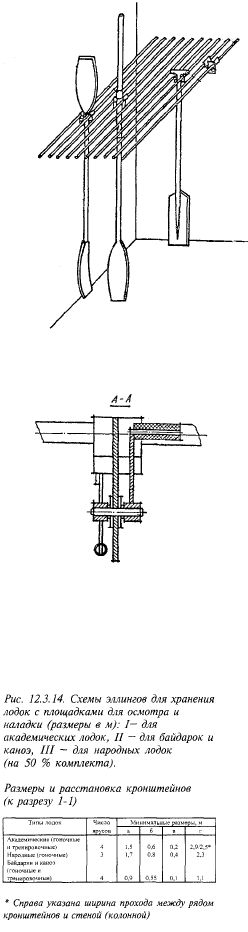 Спортивные трассы и площадки Трассы для легкоатлетических и лыжных кроссов, как правило, располагаются на прилегающих к базам территориях. Площадки для спортивных игр рекомендуется устраивать на участке базы. Необходимости в отдельных вспомогательных помещениях для них не возникает. Назначение площадок и их число определяются заданием на проектирование. Эллинги для хранения лодок размещаются за послефинишной зоной, в районе причальных плотов и стоянок лодок, как правило, раздельно для каждого вида лодок. Ширина эллинга для академических и народных лодок — 6 м, для байдарок и каноэ — 3 м. Высота эллингов (до низа выступающих конструкций) рекомендуется для академических лодок - 4,2 м, для народных лодок, байдарок и каноэ — 3 м. На универсальных базах высота эллингов принимается по наибольшим данным. Кронштейны для хранения лодок рекомендуются выдвижные. Для народных лодок, байдарок и каноэ кронштейны могут жестко крепиться к несущим конструкциям эллинга (стенам, колоннам). Кронштейны для академических лодок, как правило, должны позволять их перемещение вдоль эллинга в соответствии с размерами лодок. Каждый эллинг должен иметь свои ворота. Рекомендуются раздвижные деревянные ворота высотой 2,7 м и шириной 2,4 м — для эллингов академических и народных лодок, 1,5 м - для эллингов байдарок и каноэ. Стеллажи для хранения весел в эллингах устраиваются обычно так же, как и в залах гребных бассейнов. Для компактного хранения весел рекомендуются специальные приспособления (рис. 12.3.13), что увеличивает полезную площадь эллингов. При необходимости весла могут храниться в небольших инвентарных при эллингах. Площадки для наладки и осмотра лодок размещаются смежно с эллингами, со стороны ворот, обращенных к акватории (причальным плотам). Расчет эллингов, кронштейнов для хранения лодок, площадок для их осмотра и наладки рекомендуется вести кратно комплекту лодок (рис. 12.3.14). СПЕЦИАЛИЗИРОВАННЫЕ ФИЗКУЛЬТУРНО-СПОРТИВНЫЕ СООРУЖЕНИЯ____________________________________________ 385